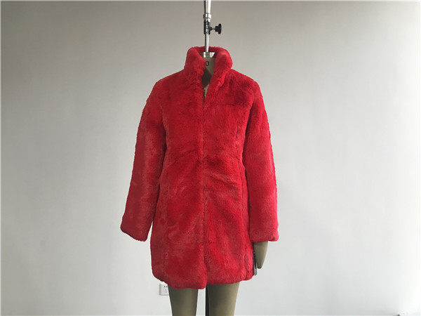 Ladies' red faux fur reverse collar medium length coat TW78516